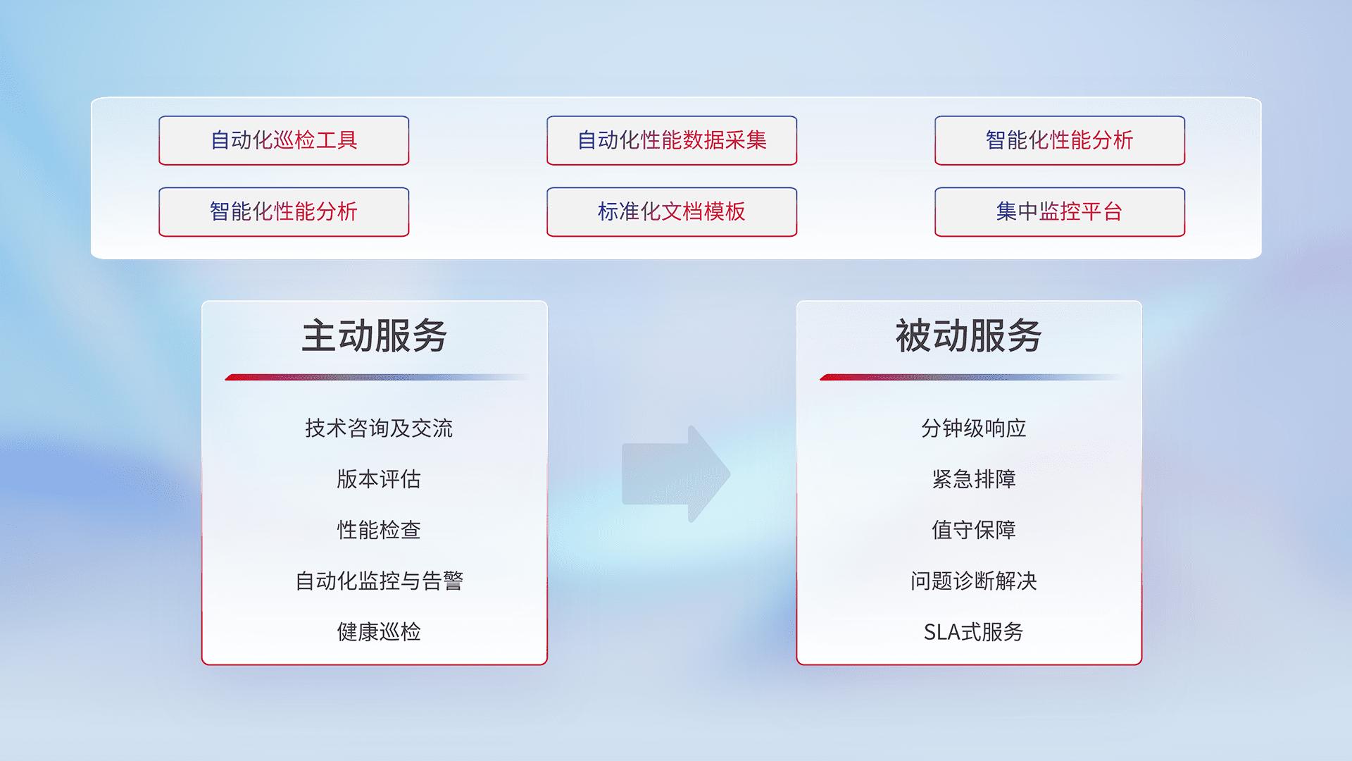 智能化工具和标准化文档,,保障服务质量,,,提供主动服务(包含技术咨询、、、版本评估、、、性能检查、、自动化监控与告警、、健康巡检)和被动服务包含(分钟级响应、、紧急排障、、、值守保障、、、问题诊断解决、、、SLA服务)。。。