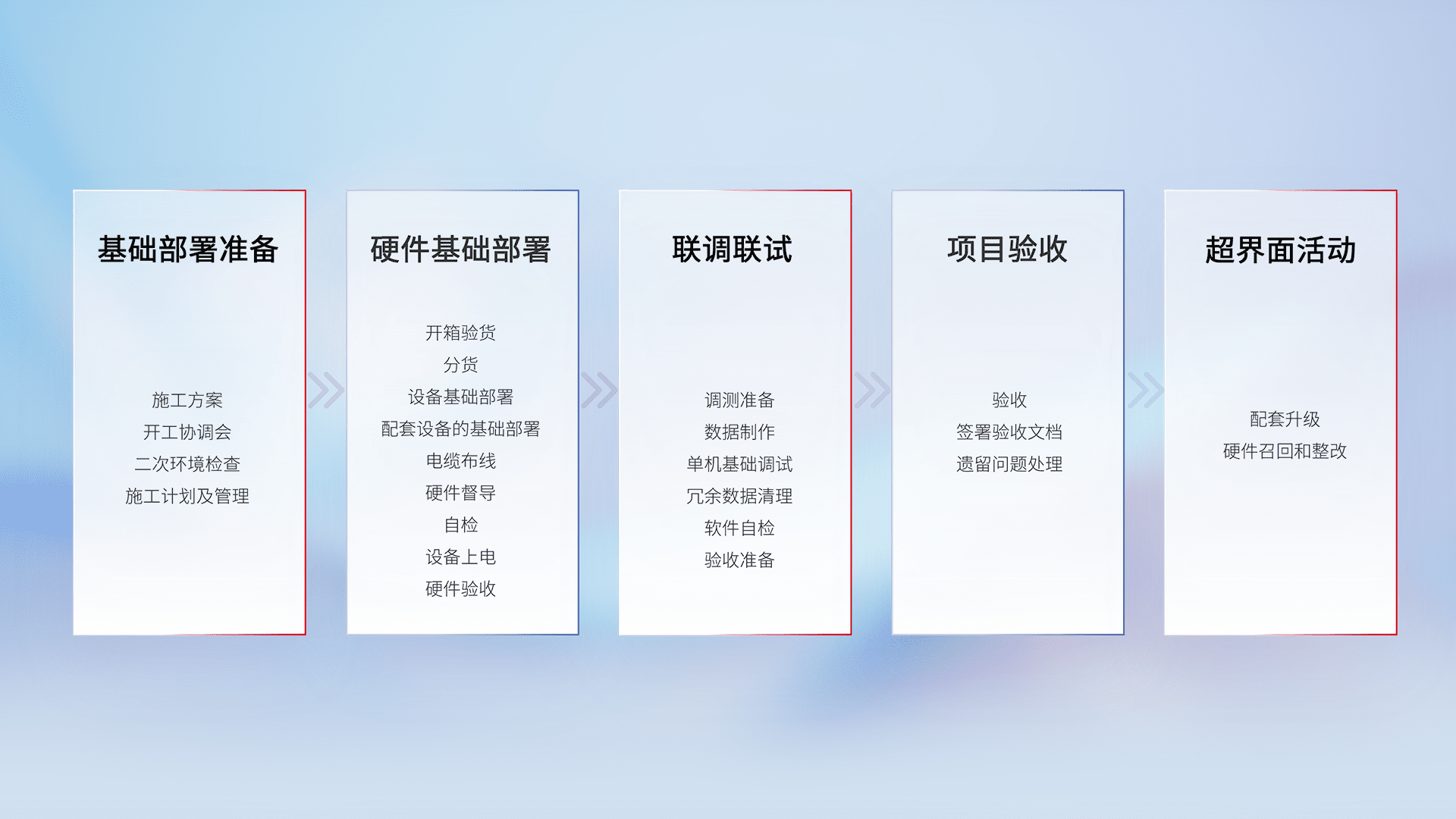 从基础部署准备、、、硬件基础部署、、、联调联试、、、、项目验收、、越界面活动的全过程可追溯,,,保证施工质量和进度。。。